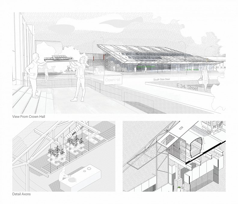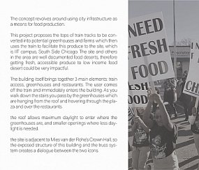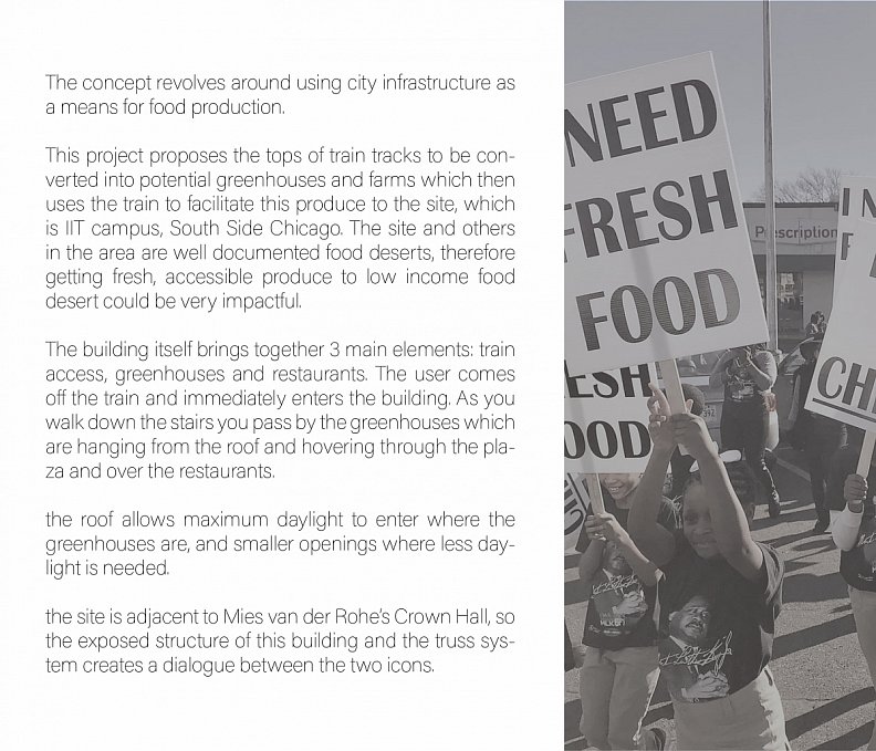 This project proposes the tops of train tracks to be converted into potential greenhouses and farms which then uses the train to facilitate this produce to the site, which is IIT campus, South Side Chicago. The site and others in the area are well documented food deserts, therefore getting fresh, accessible produce to low income food desert could be very impactful.